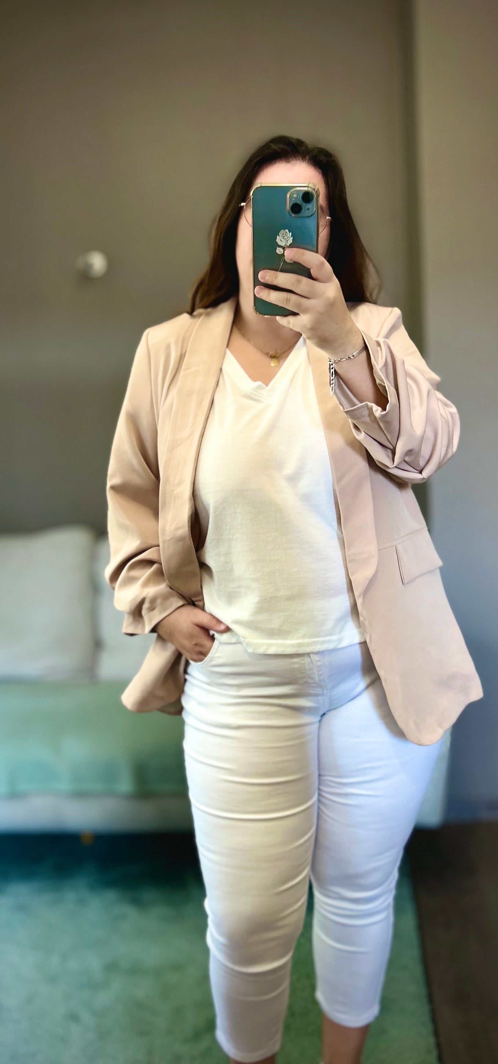 Ce blazer beige sans poche offre une silhouette épurée et élégante, parfaite pour un look soigné et moderne. Sa coupe raffinée assure un confort tout en mettant en valeur votre style avec simplicité. Idéal pour allier professionnalisme et douceur dans toutes vos tenues.