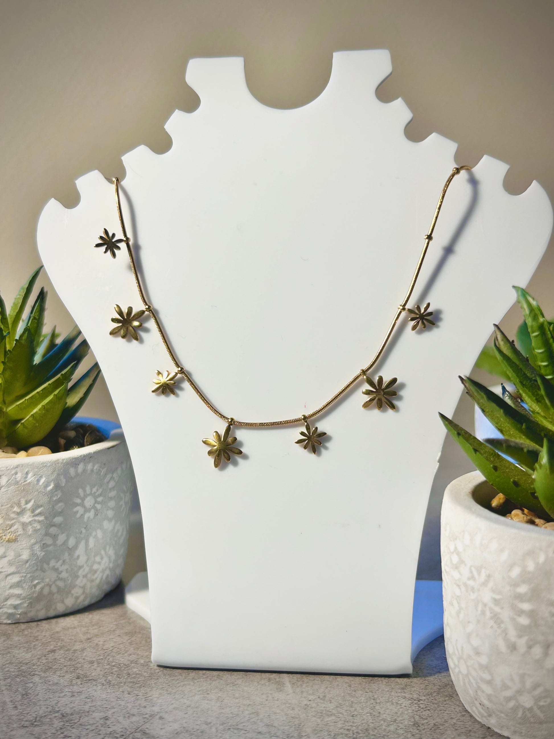 Collier délicat orné de petites fleurs scintillantes qui capturent la lumière avec élégance. Parfait pour ajouter une touche de magie à votre quotidien, ce bijou intemporel se porte facilement en toute occasion. Elles symbolisent l'espoir et les rêves, en faisant un accessoire chargé de sens. À la fois discret et remarquable, il complète harmonieusement n'importe quelle tenue et constitue un cadeau mémorable pour ceux que vous chérissez.